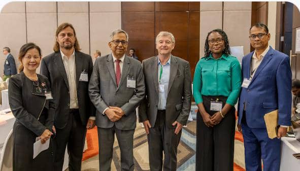 IMG-0219: Group Managing Director, Dangote Cement Plc, Arvind Pathak (2nd left); Deputy Head of Sustainability, Dangote Cement Plc, Oyekemi Oyelola (2nd right), with other delegates during a networking session at the 14th Africa CemenTrade Summit in the city of Accra, Ghana.