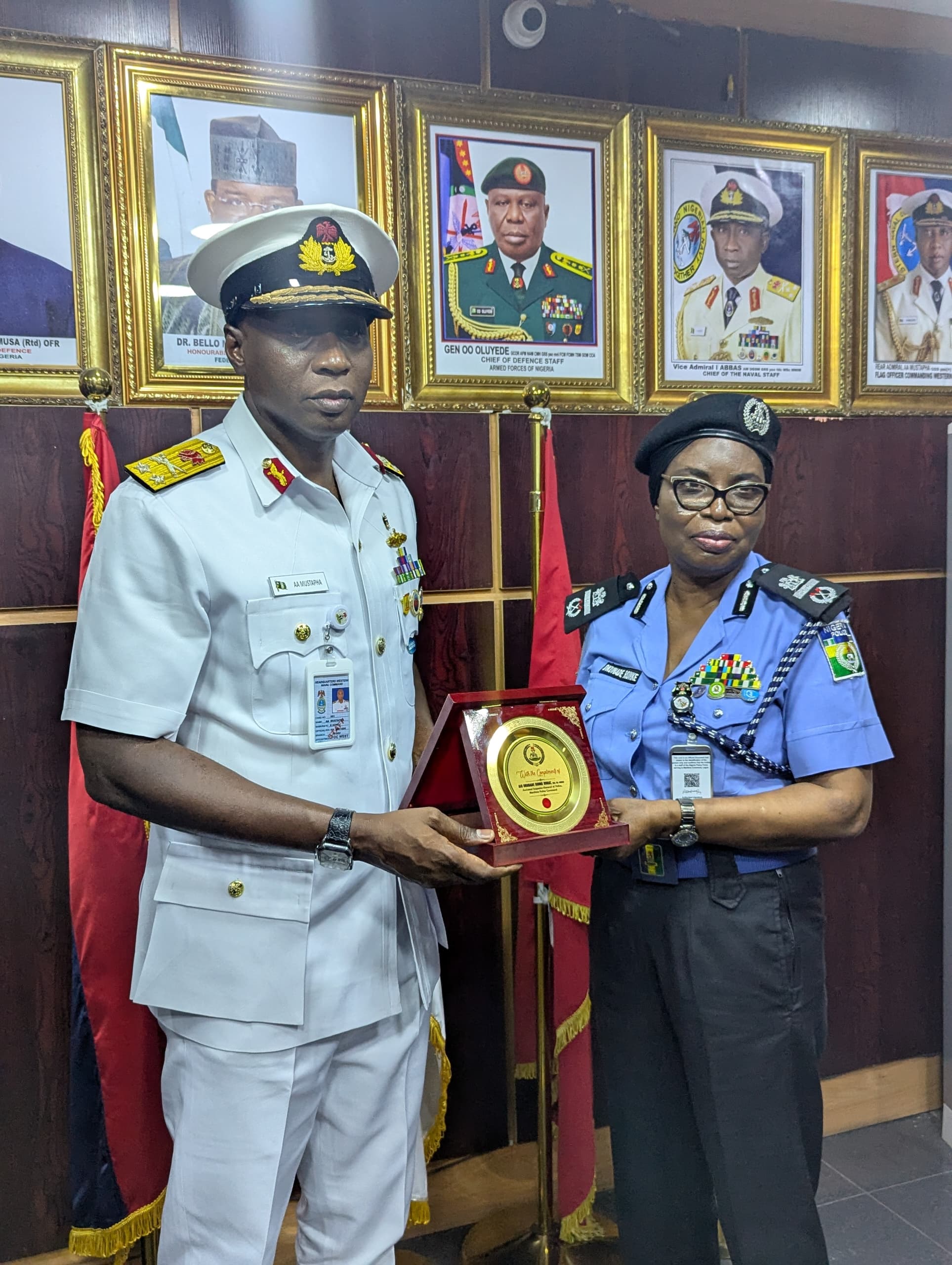 The Assistant Inspector-General of Police in charge of the Maritime Police Command, AIG Okunade Ronke Nurat, fsi, mspsp, paid a strategic courtesy visit to the Flag Officer Commanding, Western Naval Command, Rear Admiral A. A. Mustapha, at the Command headquarters to strengthen inter-agency cooperation and enhance security in Nigeria’s maritime domain.